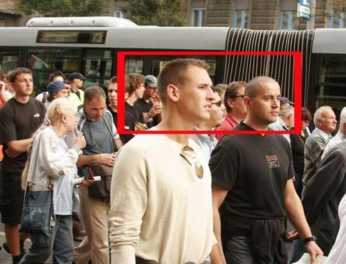 A szentkoronások hétfőn, a Corvin közben lettek figyelmesek a két tipikus REBISZ-fejűre, ahogy egy kapualjban próbálták magukat álcázni egy a helyszínen kapott szórólap olvasásával, közben szorgosan figyelték a gyülekező népet. Majd a nekik legradikálisabbnak tűnő csoportot követték a Kossuth térig. Közben egy szót sem szóltak, csak néztek mogorván, ami elég kirívó volt, mert körülöttük mindenki szidta Elqrót és a bandáját.