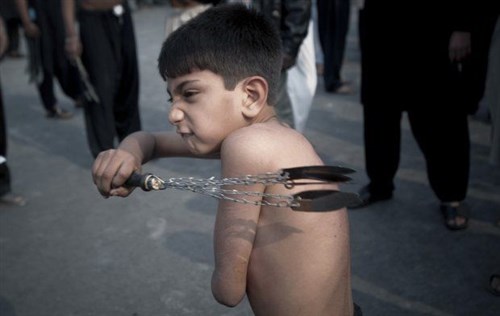 Asúrát végző (nyilvános önkínzás) mohamedán fiú (illusztráció)