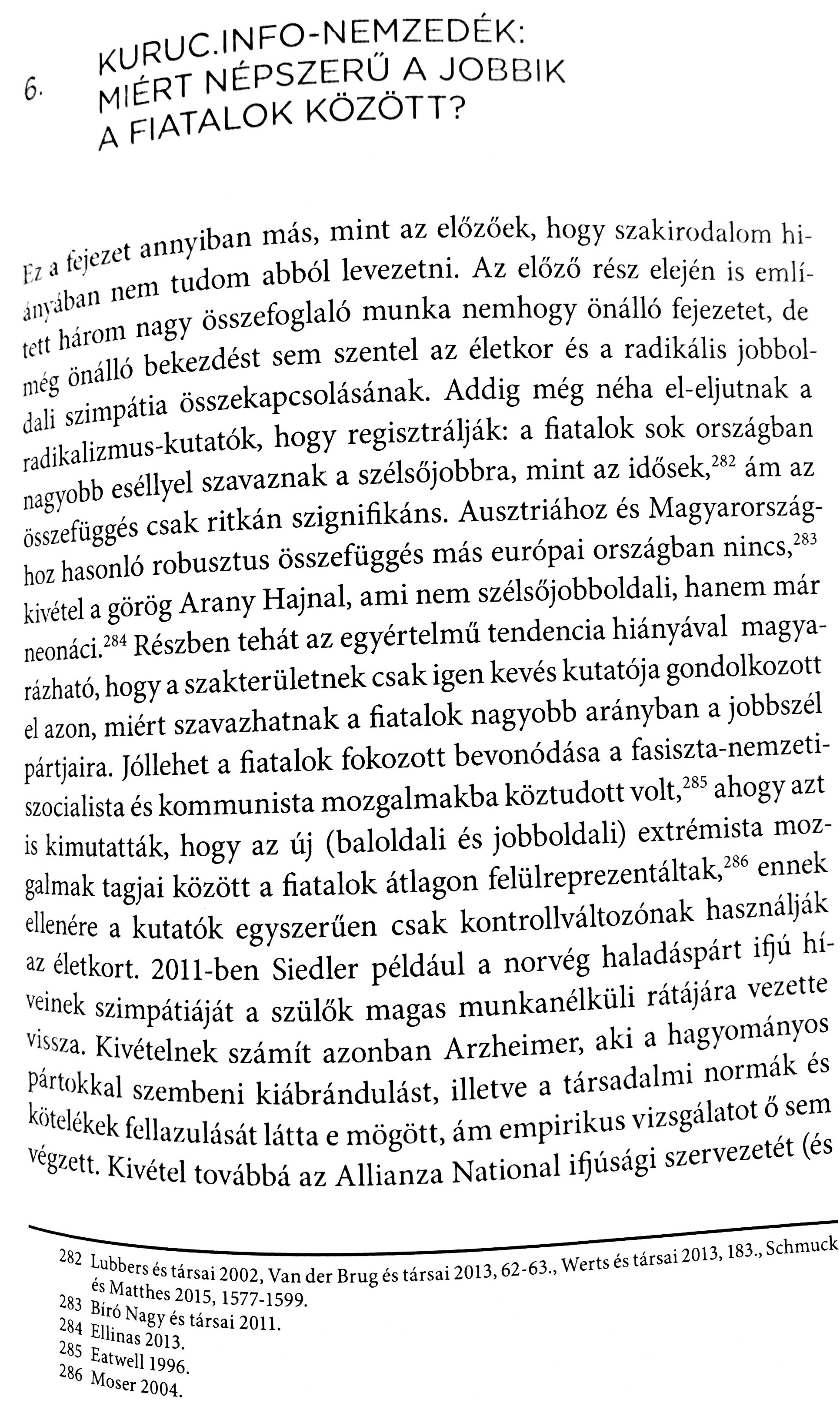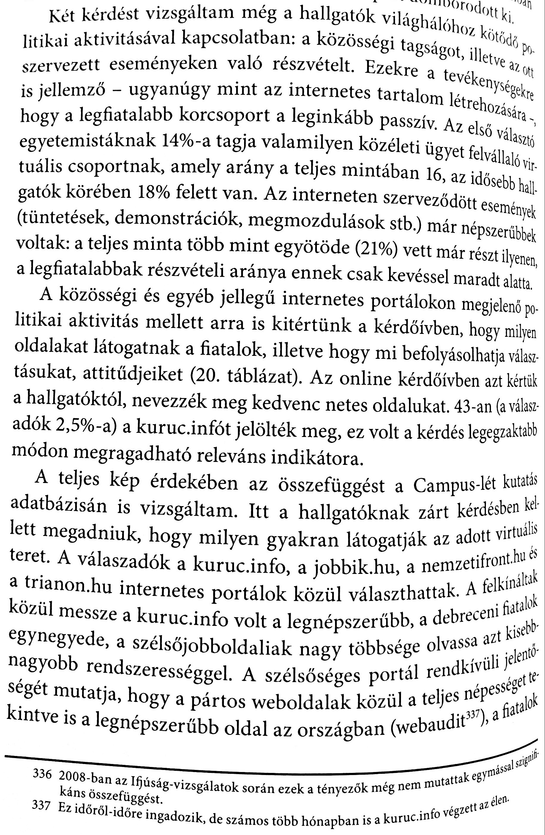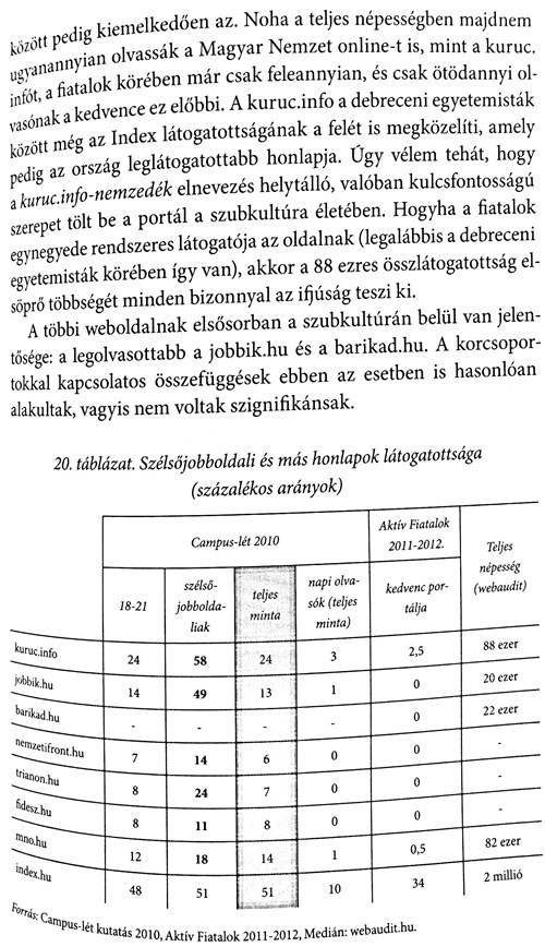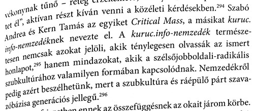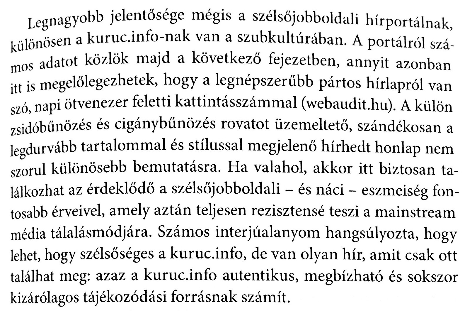 "Számos interjúalanyom hangsúlyozta, hogy lehet, hogy szélsőséges a Kuruc.info, de van olyan hír, amit csak ott találhat meg: azaz a Kuruc.info autentikus, megbízható és sokszor kizárólagos tájékozódási forrásnak számít" - áll az említett fejezetben.