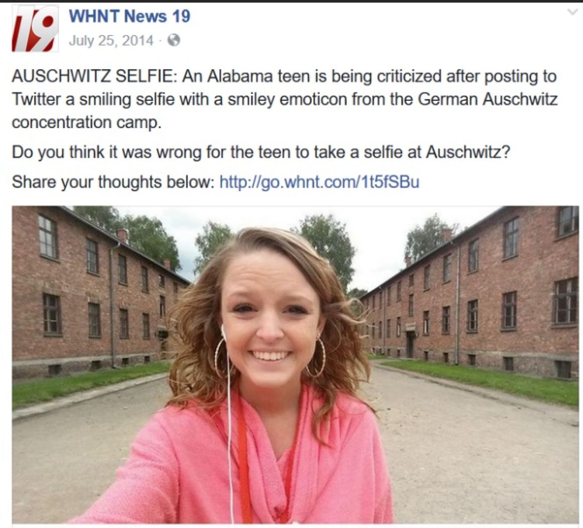 2014-ben sokaknak nem tetszett, hogy egy alabamai tini mosolygós szelfit posztot a Twitterre Auschwitzból. Az esetről rengetegen beszámoltak, többek között az alabamai WHNT News 19 csatorna is, ami aztán arra kérte a nézőit, hogy írják meg a véleményüket kommentben.