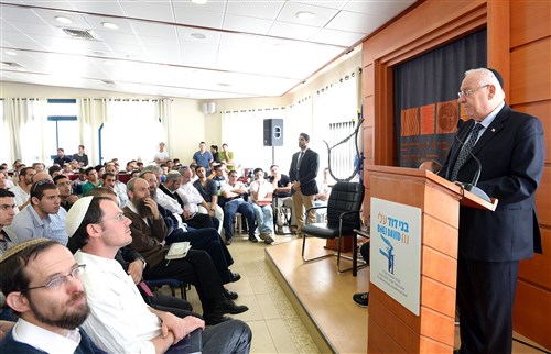 Ruvi Rivlin államelnök beszédet mond a Dávid Fiai Jesiva tanárai és növendékei előtt Éliben