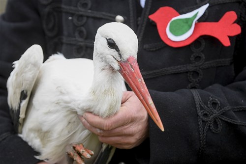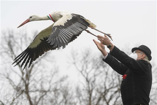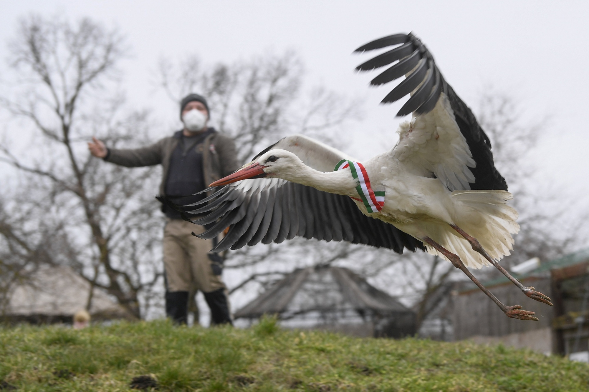 Sérülésből felépült gólya szabadon engedése előtt Déri János igazgató-állatorvos kezében a Hortobágyi Madárparkban 2021. március 15-én. Ezen a napon összesen 13 gólyát engedtek szabadon az 1848-49-es forradalom és szabadságharc kitörésének 173. évfordulójára emlékezve