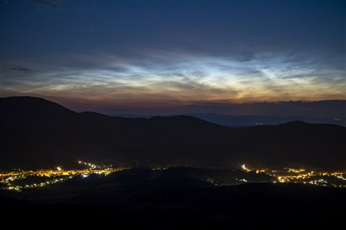 Éjszakai világító felhő (Noctilucent Cloud - NLC) Salgótarján közeléből fotózva 2021. július 4-én. A jelenséget a légkör nagy magasságú, 80-85 kilométeres rétegében lévő vízjég-kristályok okozzák, amelyek visszaverik a horizont alatt lévő Nap fényét.