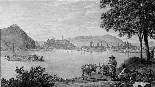 A Gellért-hegy (balra) egy 1825-ben készült litográfián (forrás: Wikipedia)
