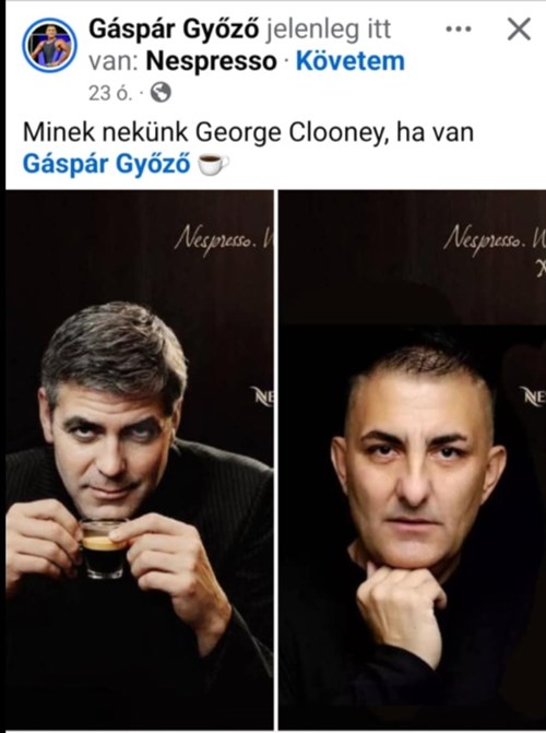 Tévedtem. Gáspár Győző oldalán valóban megtalálható az alábbi Nespresso „reklám”. Nyilván, feltűnő a hasonlóság George Clooney és közte, habár feltételezem, maga Győzike is poénnak szánta a bejegyzést. Legalábbis őszintén remélem.