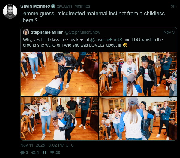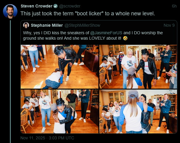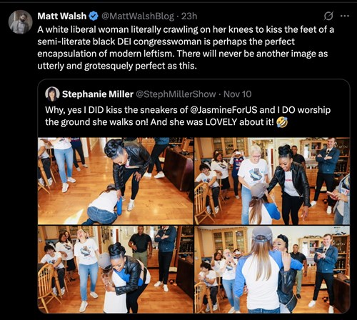 Matt Walsh: „Egy liberális fehér nő szó szerint térden csúszik, hogy megcsókolja egy félanalfabéta fekete DEI-képviselőnő lábait, ez a modern baloldaliság talán tökéletes betokozódása. Sohasem lesz egy másik ilyen teljesen és groteszken tökéletes kép, mint ez.” Stephanie Miller: „Miért, IGENIS megcsókoltam Jasmine edzőcipőit, és imádom a földet, amelyen járkál! És nagyon kedves volt miatta!”