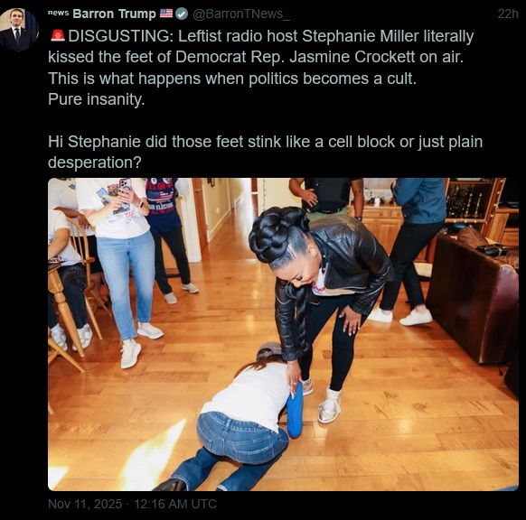 Barron Trump: „UNDORÍTÓ. A baloldali rádiós műsorvezető, Stephanie Miller szó szerint megcsókolta Jasmine Crockett demokrata képviselő lábát élő adásban. Ez történik, amikor a politika kultusszá válik. Tiszta őrület. Szia Stephanie, ezek a lábak bűzlöttek, mint egy börtöncella vagy csupán sima kétségbeesés?”