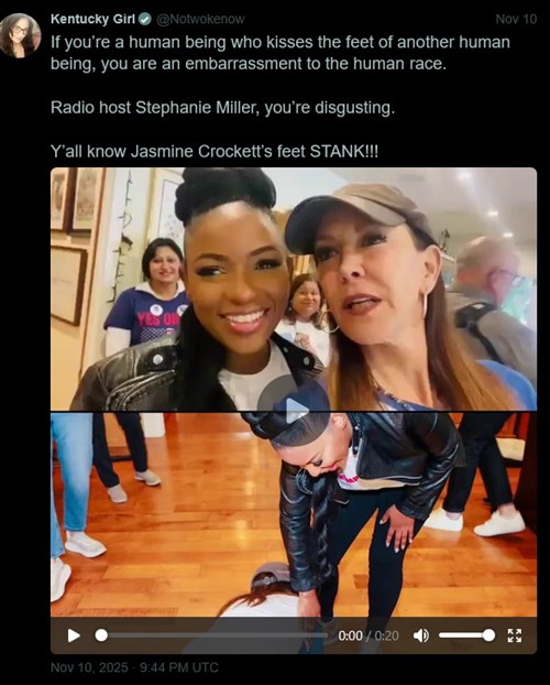 Kentucky Girl: „Ha olyan ember vagy, aki egy másik ember lábát csókolja, az szégyen az emberiségre nézve. Stephanie Miller műsorvezető, undorító vagy. Mindenki tudja, hogy Jasmine Crockett lába bűzlik!!!”