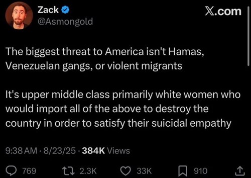 Asmongold: „A legnagyobb fenyegetést Amerikára nem a Hamász, a venezuelai bandák vagy az erőszakos migránsok jelentik, hanem a felső középosztálybeli, főleg fehér nők, akik behoznák az előbbieket mind, hogy lerombolják az országot az öngyilkos empátiájuk kielégítésére.”