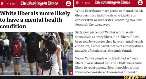 A liberális fehérek 62 százaléka szenved különböző elmezavarokban, szemben a konzervatívok 26 és a mérsékeltek 20 százalékával