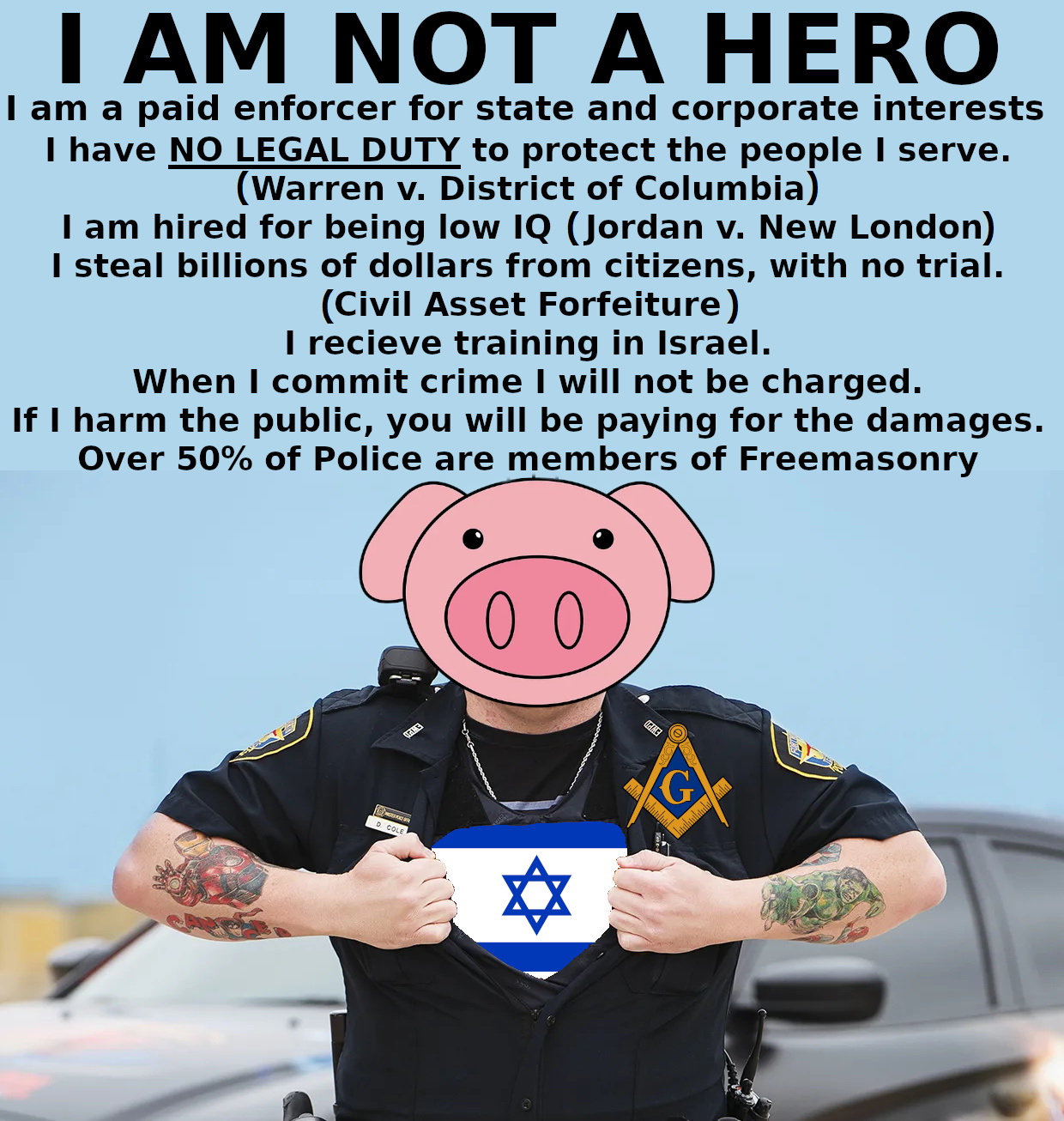 Nem vagyok hős, az állami és vállalati érdekek fizetett végrehajtója vagyok. Nincs törvényes kötelességem az emberek védelmére, akiket szolgálok. Azért béreltek fel, mert alacsony az IQ-m. Milliárdokat lopok az állampolgároktól törvényes következmények nélkül. Izraelben kapok kiképzést. Ha elkövetek egy bűncselekményt, nem vonnak felelősségre. Ha sérelmet okozok a közösségnek, a közösség fizeti a károkat. Minden második közülünk szabadkőműves. Az amerikai zsargonban a zsaruk egyik gúnyneve a "disznó" (pig)
