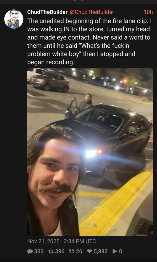 "A tűzoltósávos klip vágatlan eleje. Az üzletbe tartok, elfordítom a fejem és szemkontaktust létesítek. Egy szót sem szóltam hozzájuk, amíg az egyikük azt nem mondta, hogy "mi a fasz problémád van, fehér fiú?", akkor megálltam és elkezdtem felvenni"