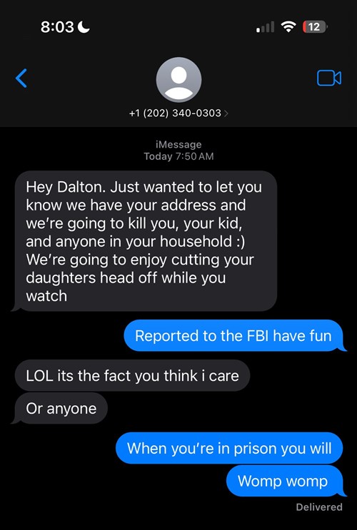 Egy másik tudatja vele, hogy ismerik a lakcímét, és ki fogják irtani az egész családját, "élvezni fogjuk, hogy levágjuk a lányaid fejét, miközben nézed", fittyet hányva Dalton figyelmeztetésére, hogy bejelentette az FBI-nak
