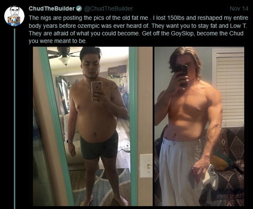 "A négerek olyan fotókat mutogatnak rólam, amelyeken még kövér voltam. Leadtam több mint 60 kilót és átformáltam az egész testemet még évekkel azelőtt, hogy az Ozempic nevét hallottam volna. Azt akarják, hogy kövér maradj és alacsony legyen a tesztoszteronszinted. Félnek attól, amivé válhatsz. Szokj le a gojmoslékról (az egészségtelen amerikai kaja antiszemita elnevezése – GI), és légy az az alfahím, akinek lenned kell!"