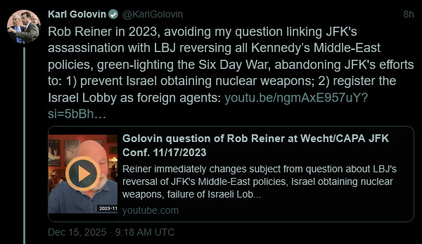 2023-ban Rob Reiner, az állítólagos "rettenthetetlen igazmondó" azonnal témát váltott, és elsumákolta a választ arra kérdésre, amely összekapcsolta John Kennedy meggyilkolását azzal, hogy az utóda, Lyndon B. Johnson megváltoztatta Kennedy közel-keleti politikáját, zöld utat adva a hat napos háborúra és elvetve Kennedy erőfeszítéseit, hogy megakadályozza Izraelt atomfegyverek beszerzésében, és idegen ügynökként vegye nyilvántartásba az Izrael-lobbit