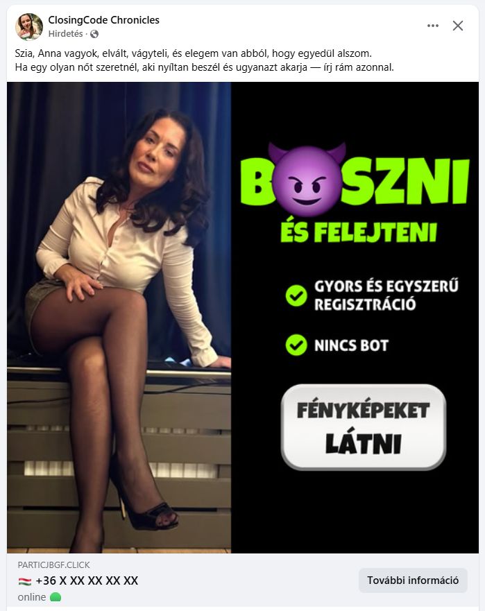 Olvasónk már többször jelezte, hogy érdektelenek számára az ilyen jellegű hirdetések, ám a Facebook fittyet hány a felhasználók visszajelzéseire, és csak a „politikailag nem korrekt” tartalmakat nyirbálja, így „elvált, vágyteli” Anna továbbra is része marad olvasónk hírfolyamának.