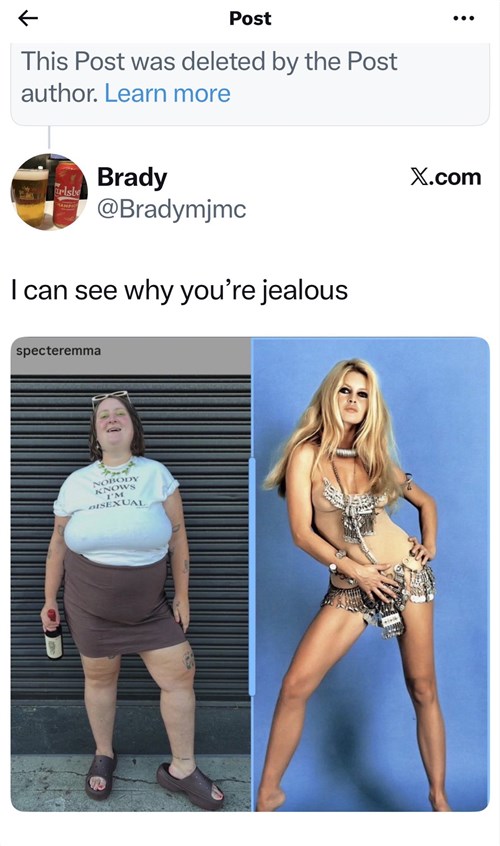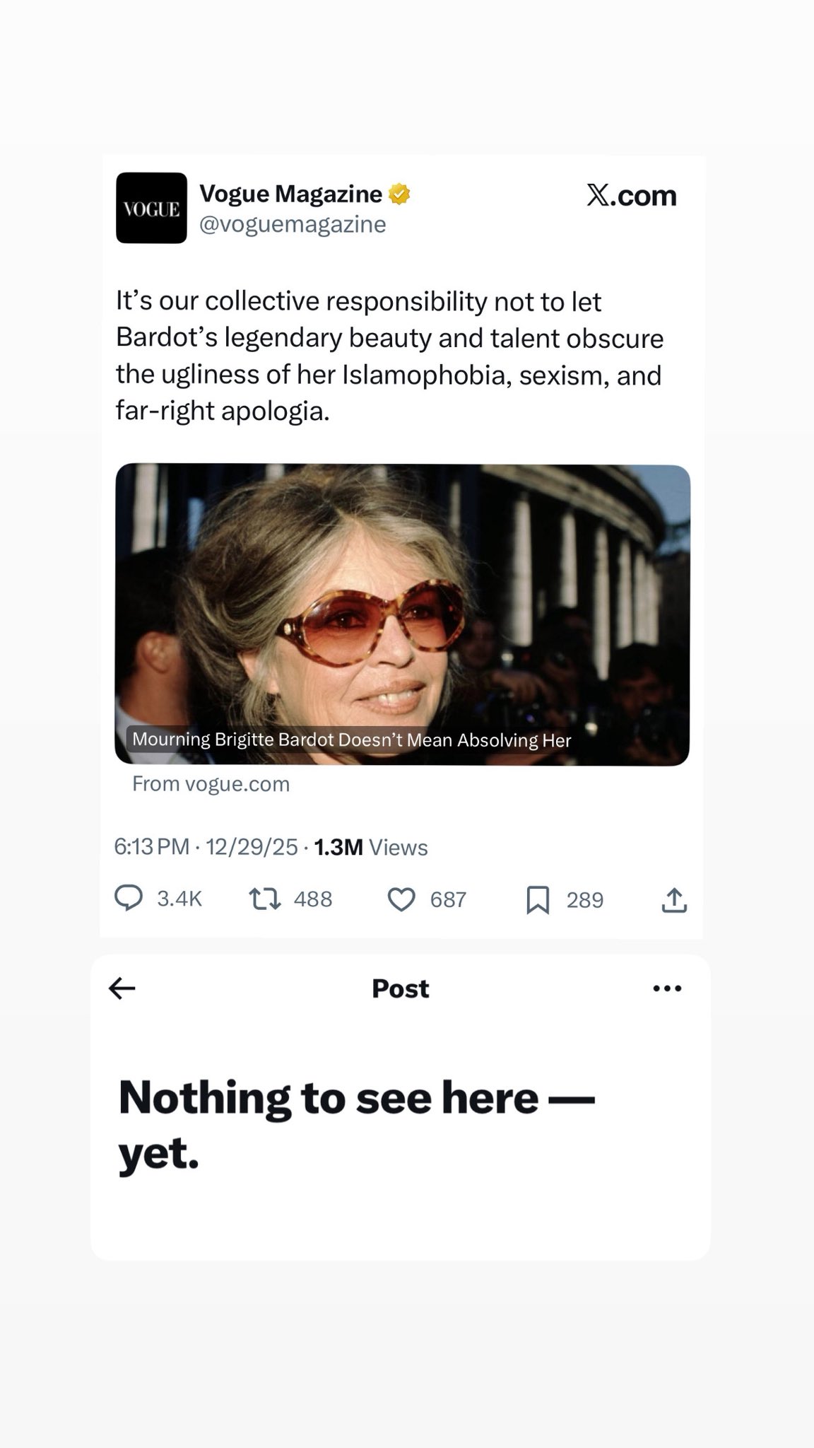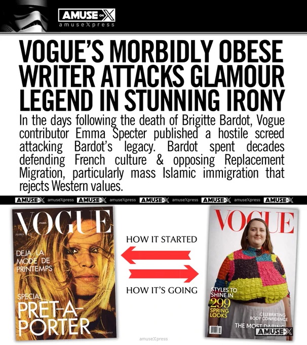 A Vogue morbid módon kövér újságírója nyomasztó iróniával támadja a glamour-legendát. Emma Specter közzétett egy ellenséges szónoklatot Bardot örökségét támadva, aki az utóbbi évtizedeket a francia kultúra védelmével töltötte, szembeszállva a nyugati értékeket elutasító népességcserés, főleg muszlim bevándorlással. A Vogue címlaplányai egykor és ma - korszakunk degenerálódásának látlelete