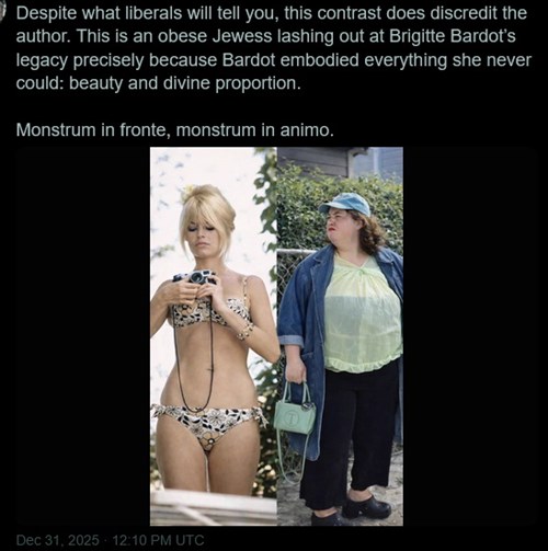 Ellentétben azzal, amit a liberálisok fognak mondani, ez a kontraszt diszkreditálja a szerzőt. Ez egy kövér zsidó, aki pontosan azért intéz kirohanást BB öröksége ellen, mert Bardot megtestesítette mindazt, amit ő sohasem tud: a szépséget és az isteni arányokat. „Szörny az arcon, szörny a lélekben.” (Latin szerzők nyomán Nietzsche)