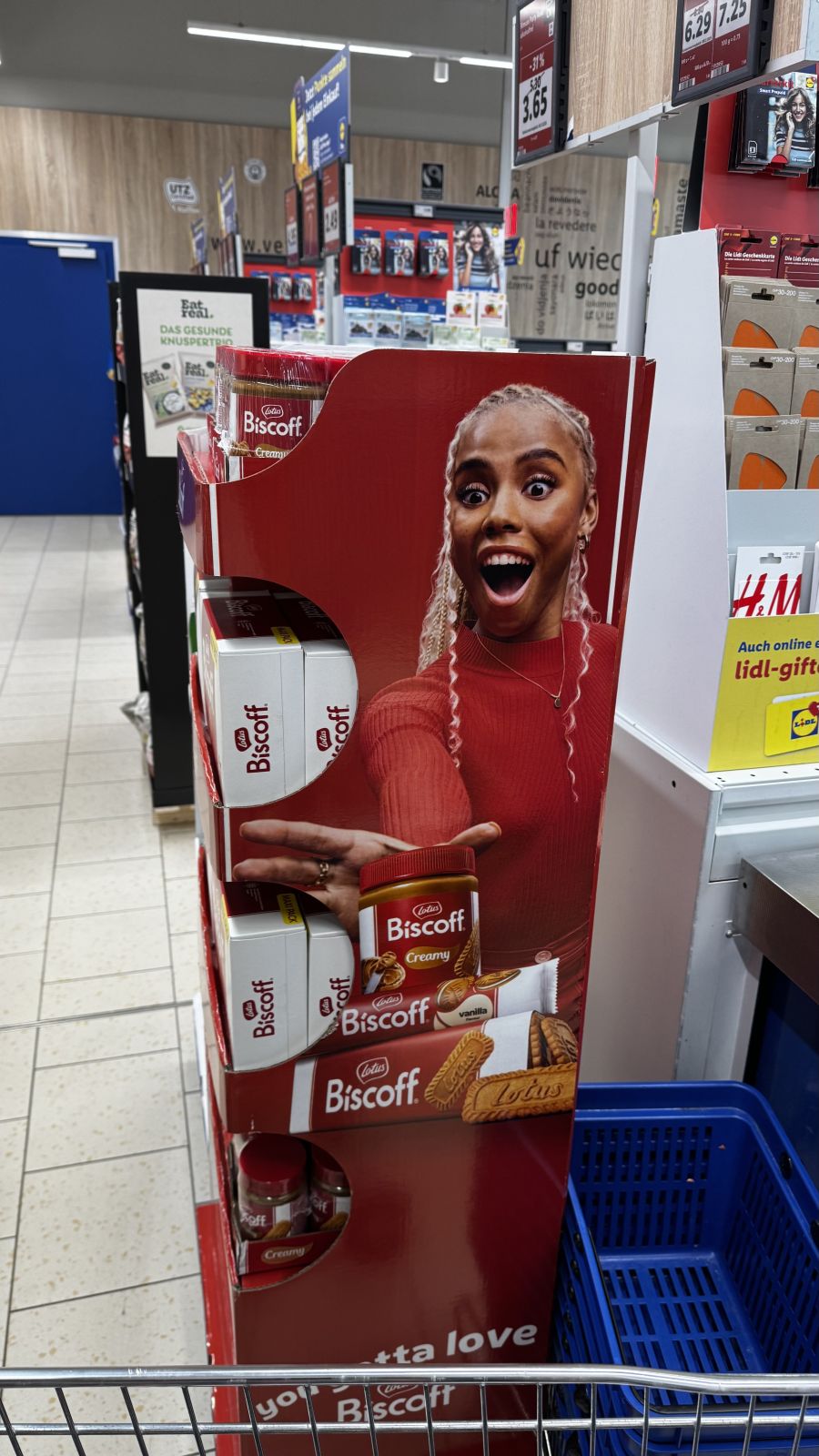 1. Végül pedig egy olvasónk által küldött kép egy svájci Lidlből, ahol egy kekszet, mogyorókrémet forgalmazó cég úgy gondolta, ezzel a hölggyel érdemes a leginkább hirdetni a termékeiket Európa kellős közepén.