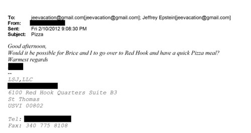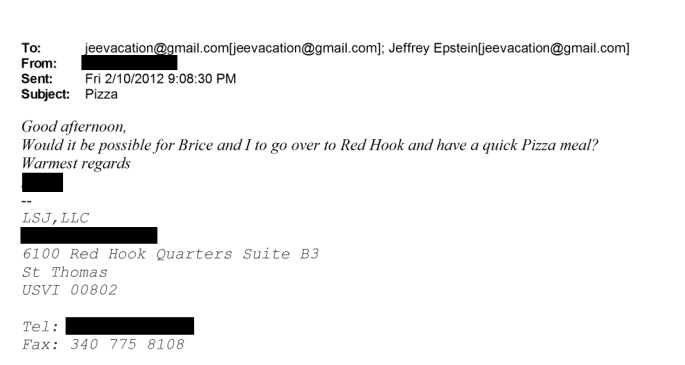 A feladó neve ki lett cenzúrázva, és "Brice" kiléte nem tisztázott, de egy Brice Gordon nevű új-zélandi személyt (aki korábban a hadseregben volt szakács, és segített Epstein új-mexikói telepét irányítani) az FBI 2007-ben kihallgatott. Red Hook egy be nem jegyzett település az Amerikai Virgin-szigeteken, a 2020-as népszámlálás szerint a legkisebb lakosságú település, amely főként kikötőkből áll. Van ott egy pizzéria is. De miért lenne szüksége valakinek Epstein engedélyére ahhoz, hogy "gyorsan bedobjon egy pizzát", amelyre a pénzembert nem hívták meg? Ez elég ahhoz, hogy egy értelmes embert gondolkodásra késztessen."