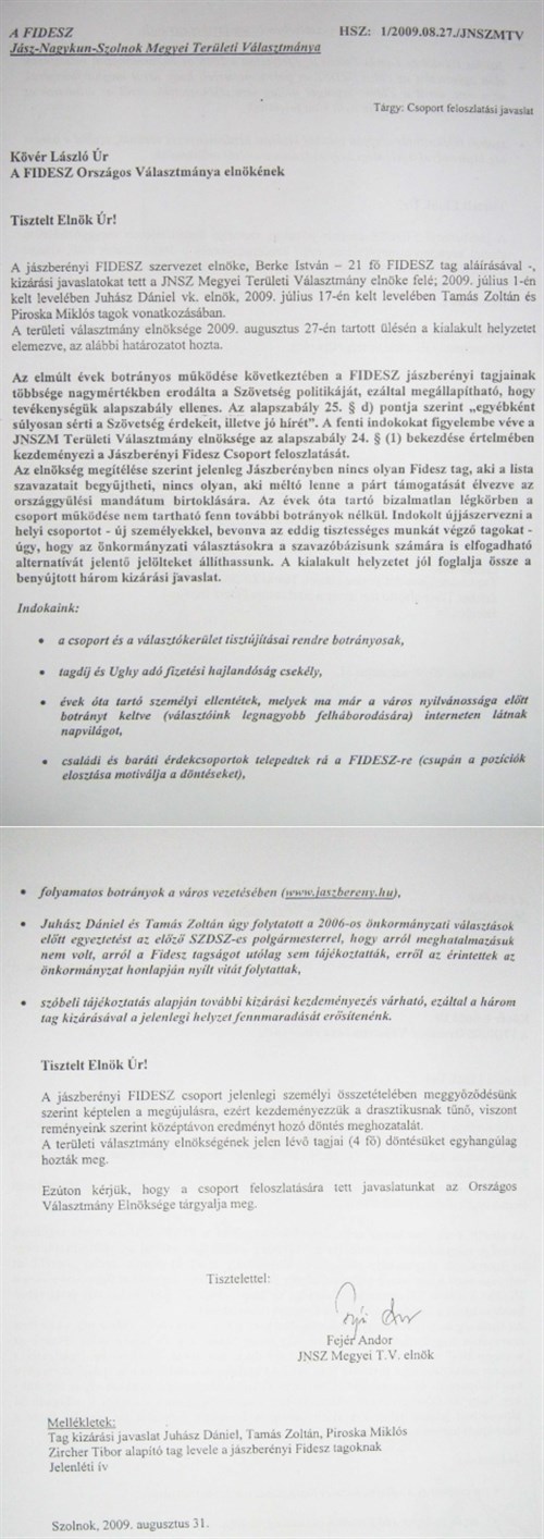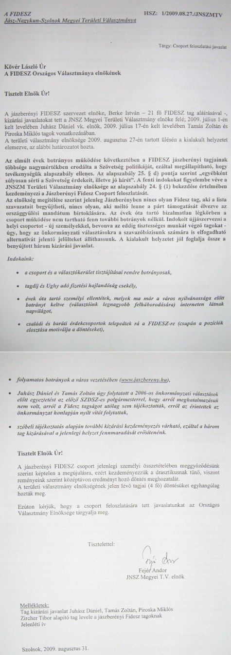 A sorozatos botrányok miatt feloszlatja magát a jászberényi Fidesz, alább olvasható a birtokunkba jutott kérelem.
