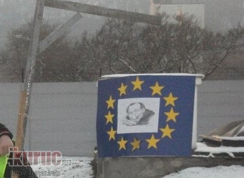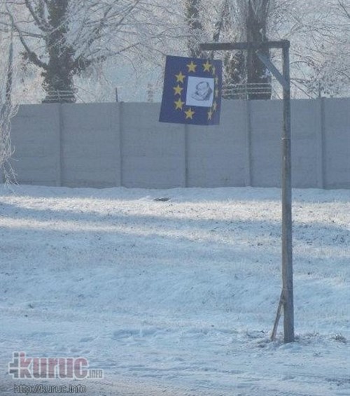 És végül egy igazi csendélet: az EU jelképének (és szimbolikusan zsidóbérenc vezetőinek) is megtalálták a helyét egy rögtönzött akasztófán: