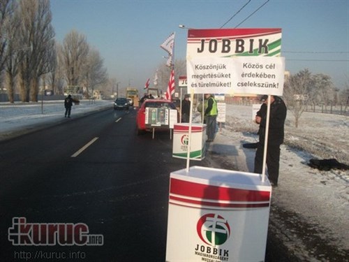 A Jobbik és a Szebb Jövőért Polgárőrség a mai napon Kazincbarcikánál, a 26-os úton demonstrált a népnyúzók Magyarországa ellen.