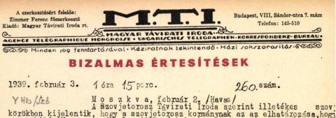 Moszkva, február 2., 1:15 (Havas) A Szovjetorosz Távirati Iroda szerint illetékes szovjet körökben kijelentik, hogy a szovjetorosz kormánynak az az elhatározása, hogy megszakítja Magyarországgal a diplomáciai viszonyt összefügg azzal a ténnyel, hogy Magyarország a müncheni egyezmény következtében az utóbbi időben erős nyomás alatt van bizonyos államok részéről. A magyar kormány politikája bizonyítja, hogy könnyen enged ennek a nyomásnak, mert függetlenségét tekintélyes mértékben elvesztette. A többi közt rámutatnak arra, hogy a magyar kormánynak az az elhatározása, hogy csatlakozik a komintern-ellenesnek mondott szerződéshez, csak a magyar állam érdekeivel okolható meg, ezek pedig semmiképpen sem felelnek meg azoknak a támadó céloknak, amelyeket ennek az egyezménynek örve alatt aláírói – elsősorban Japán – szem előtt tartanak. Ezt az elhatározást ennélfogva kívülről erőszakolták rá a magyar kormányra. Ez a helyzet Magyarországon nem okolja meg többé a diplomáciai viszony fenntartását közte és a szovjet-kormány közt a két állam fővárosaiban székelő külön-képviseletek útján. A jövőben ezt a viszonyt a két államnak egy másik állam fővárosában levő képviseletei közbejöttével lehet fenntartani. (MTI)