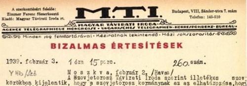 London, február 3., 9:40 (MTI) Az összes angol lapok kivétel nélkül – valószínűleg központi sugalmazásra – közlik a Reuter-iroda által kiadott Tass-közleményt a budapesti szovjetkövetség megszüntetéséről. Néhány lap a hír fontosságát messze túlhaladó feltűnő beállításban közli a hírt. Valamennyi lap kiemeli a Reuter-iroda által közölt indokolást: „Szovjetkörök különbséget tesznek a kommunistaellenes egyezmény többi aláírói és Magyarország között, mert a többi aláíró ország független állam, ellenben Magyarország, pusztán a berlin–római tengely függvénye lévén, nem érdemel teljes diplomáciai jogállást”.