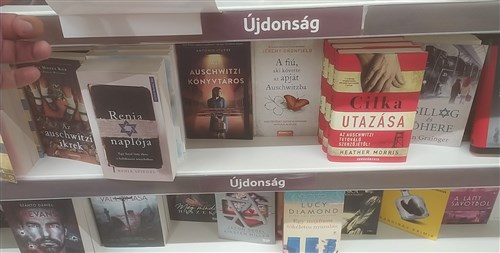 3. A következő, meglehetősen beszédes képet kedves olvasónknak köszönhetjük, aki egy magyarországi Tescóban rögzítette a „könyvújdonságok” polcát. Ahogy látható, a kínálat meglehetősen egyhangú, hamar holokauszt-túltengést kaphat a gyanútlan kíváncsiskodó. Olvasónk A fiú, aki követte az apját Auschwitzba című könyvhöz csak annyi megjegyzését fűzött, hogy „jól tette”.