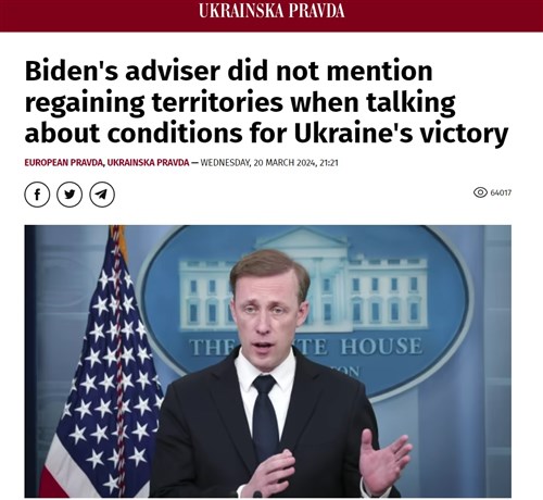 Az Ukrajinszka Pravda arról ír, hogy Jake Sullivan amerikai nemzetbiztonsági tanácsadó nem említette Ukrajna területi integritásának helyreállítását a győzelmi feltételek között, vette észre a Mandiner. Szerinte Ukrajna akkor győz, ha szuverén, demokratikus és szabad országként kerül ki a háborúból – de ennyi, konkrétumok nélkül.