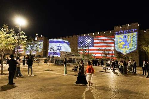 Ünneplés Jeruzsálemben amerikai zászlókkal (fotó: Sinan Abu Mayzer / Reuters)