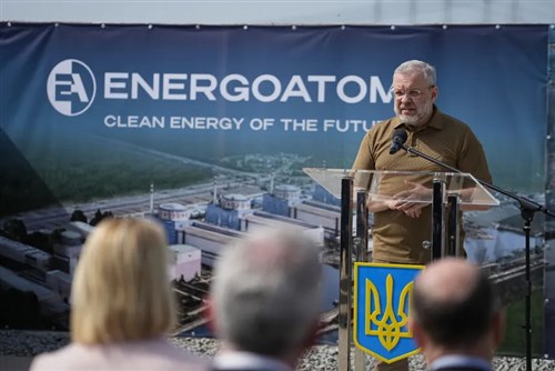 Herman Haluscsenko beszédet mond a hmelnickiji atomerőmű ötödik blokkja építésének megkezdését ünneplő rendezvényen 2024. április 11-én (fotó: Meetband / Energoatom / Global Images Ukraine / Getty Images)