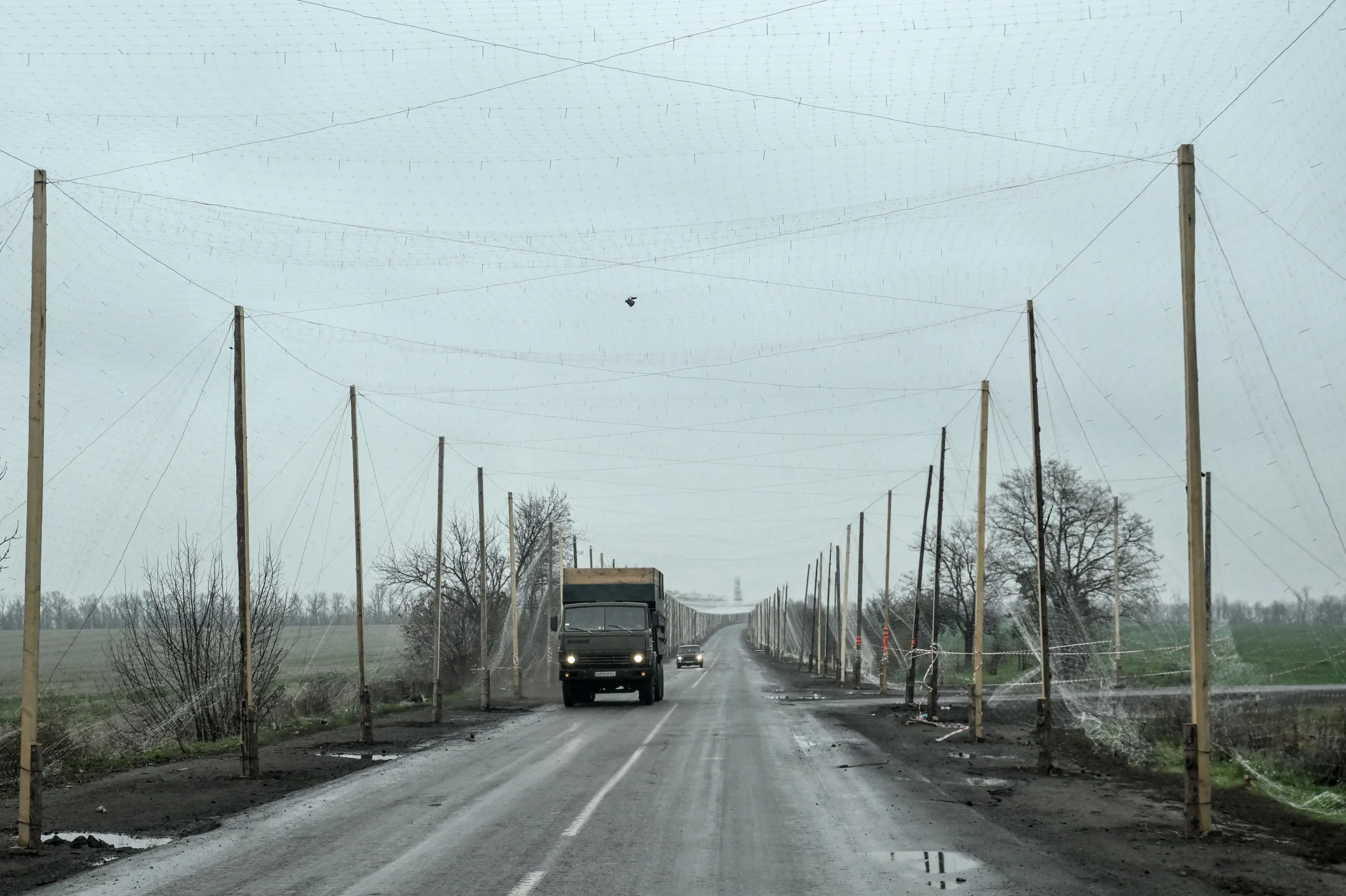 Drónellenes hálóval védett út Pokrovszk környékén 2025. november 11-én (fotó: Dmytro Smolienko / Ukrinform / NurPhoto)