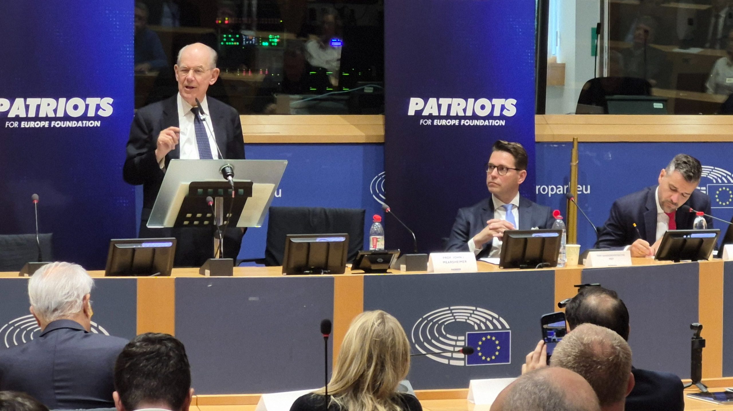 Mearsheimer professzor László András magyar EP-képviselő és a Patrióták Európáért szövetség meghívására érkezett megtartani előadását.