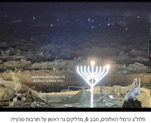 Hanukalángot, pontosabban gyertyát gyújtottak a Karmeli dandár megfigyelő és mesterlövész századának katonái is, mégpedig Gázaváros földdel egyelővé tett Sedzsáijjá negyedében is. A Telegramra kitett fotó alatt ez olvasható:
