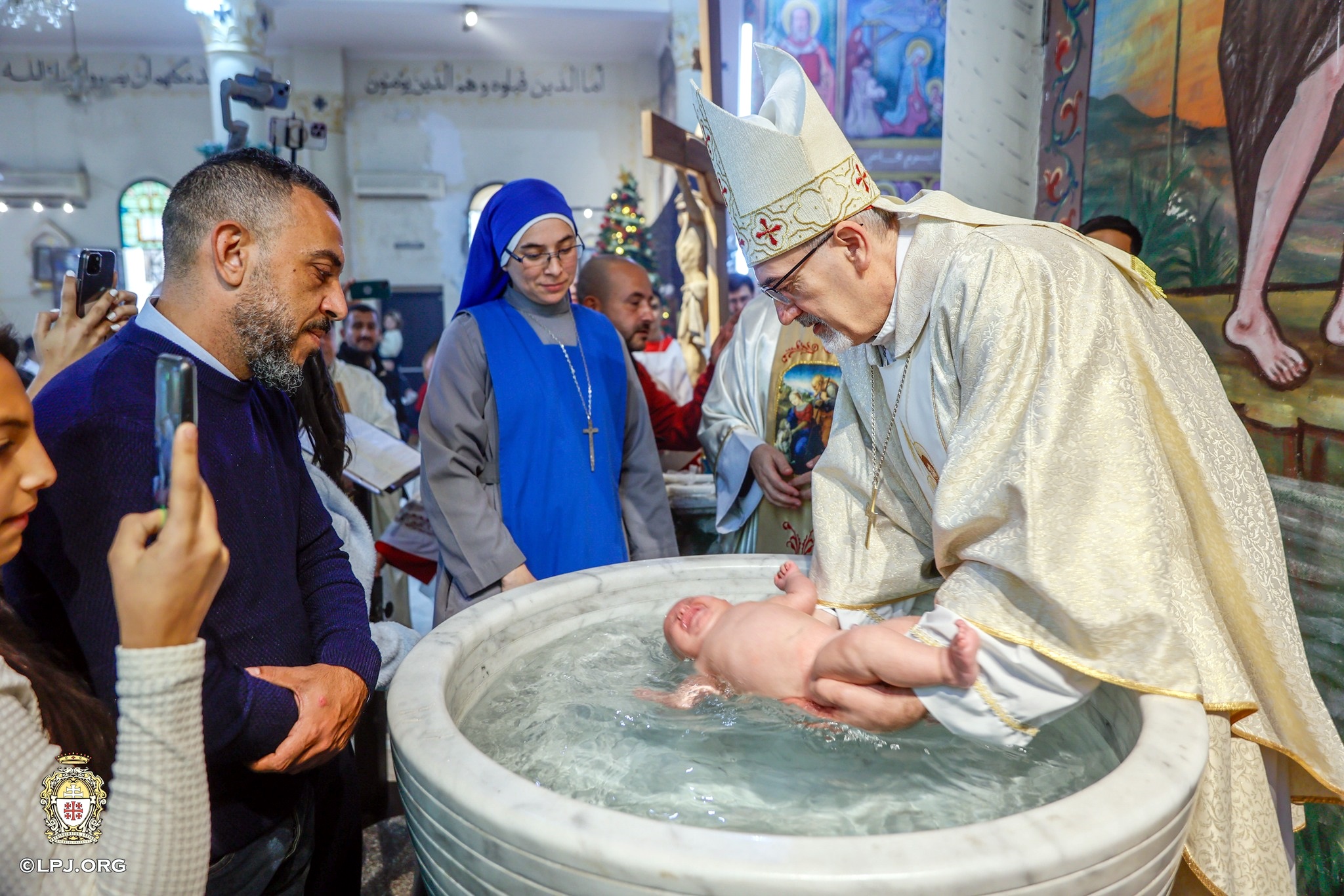 Jeruzsálem latin pátriárkája csecsemőt keresztel a Szent Család-templomban (fotó: lpj.org)