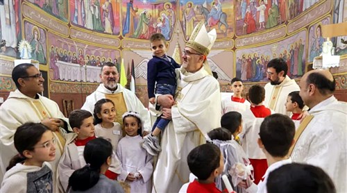 Pierbattista Pizzaballa bíboros szentmisét celebrál a gázavárosi Szent Család-templomban (fotó: lpj.org)