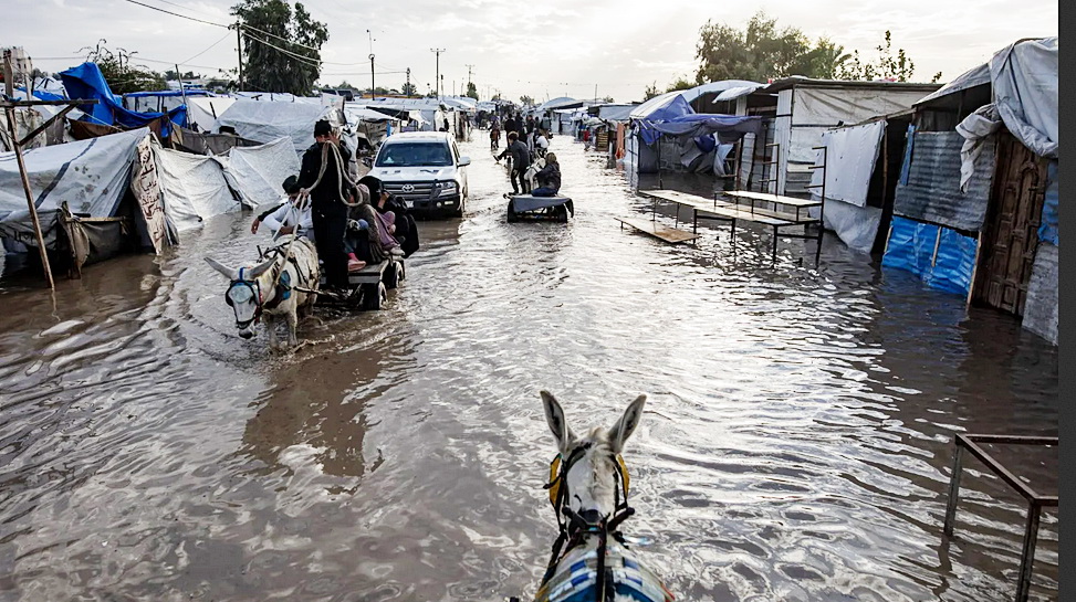 Lakóhelyükről elűzött, kibombázott palesztinok szamár vontatta kordékon közlekednek sátraik között az esőzések miatt elárasztott utakon Hán Júnesz városban, 2025 decemberében - ez is a népirtás eszköze… (fotó: EPA)