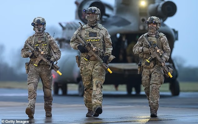 A brit különleges erők tagjai, háttérben egy Chinook helikopterrel