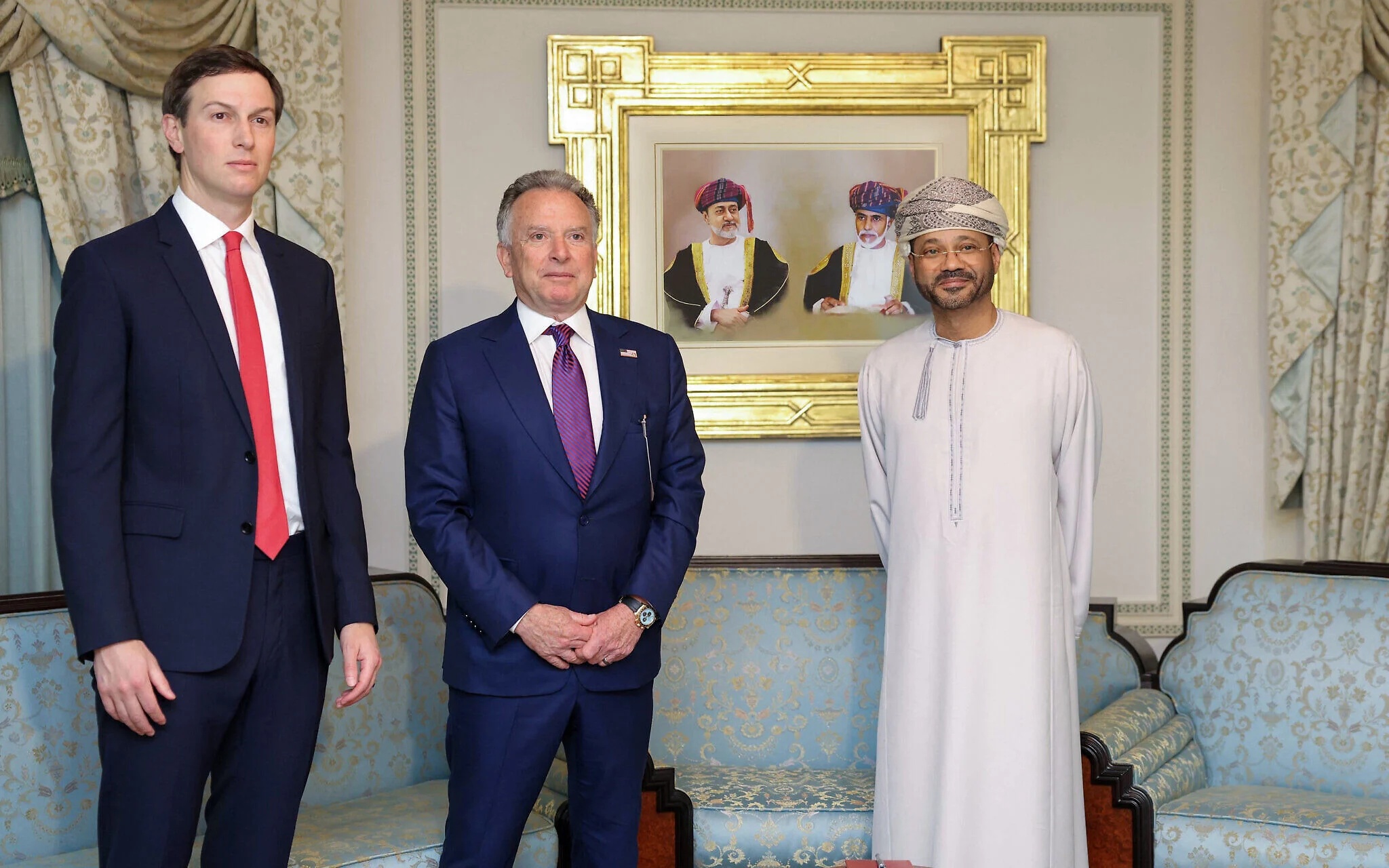 Badr bin Hamad al-Búszaídi Trump két utazó zsidója, Witkoff és Kushner társaságában 2026. február 6-án (fotó: AFP)