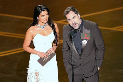 Javier Bardem politikai jelszavakat mond a mikrofonba Priyanka Chopra mellett