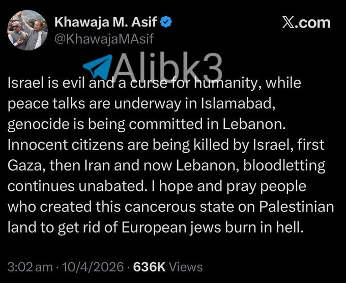 Havádzsá Mohammed Ászif (76) pakisztáni védelmi miniszter szerint Izrael népirtást hajtott végre előbb a Gázai övezetben, utána Iránban, majd most Libanonban is. A miniszter egyben azt kívánta: a pokol tüzén égjenek el azok, akik a „rákos” Izraelt létrehozták Palesztina földjén azért, hogy megszabaduljanak az európai zsidóktól. Ászif időközben törölte az X-oldalára kitett bejegyzését – írja a Jediot Aharonot.