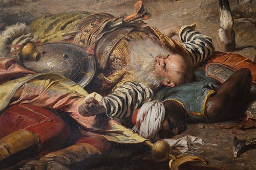 Lotaringiai Károly előtt fekvő török fővezér Abdurrahmán Abdi Arnaut pasa holtteteme Benczúr Gyula Budavár visszavétele a töröktől 1686-ban című festményén