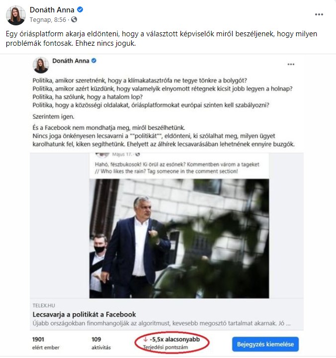 Meglehetősen szokatlan szerepben találta magát Donáth Anna, mikor azzal szembesült, hogy a bejegyzéseinek eléréseit drasztikusan lecsavarta a Facebook. Frusztrációja érthető, hiszen feléjük generációk óta bevett gyakorlat, hogy nem a cenzúrázottak, hanem a cenzorok oldalán állnak.