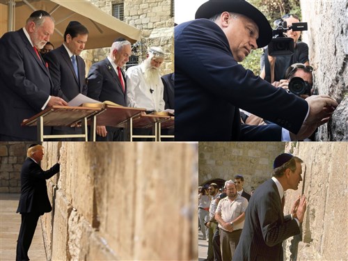 Marco Rudio amerikai külügyminiszter és Mike Huckabee izraeli nagykövet a Siratófalnál, valamint Orbán Viktor, Trump és Bush ugyanott. Netanjáhú vajon mikor fog egy templomba ellátogatni?
