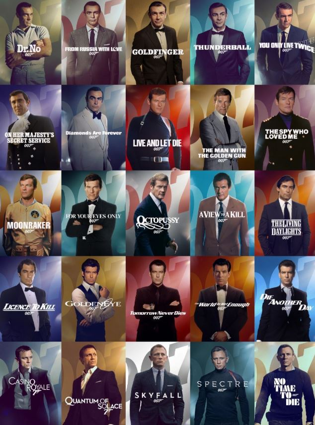 Mint azt bizonyára mindenki tudja, a hosszú évtizedek óta futó franchise címszereplőjét több híres színész is eljátszotta, mint például Sean Connery, Roger Moore, vagy éppen Pierce Brosnan. Debütáláskor minden film saját plakátot (plakátokat) kapott, rajta a címszereplővel, és lévén egy akciódús kémsztori – gyakran fegyverrel kiegészítve.
