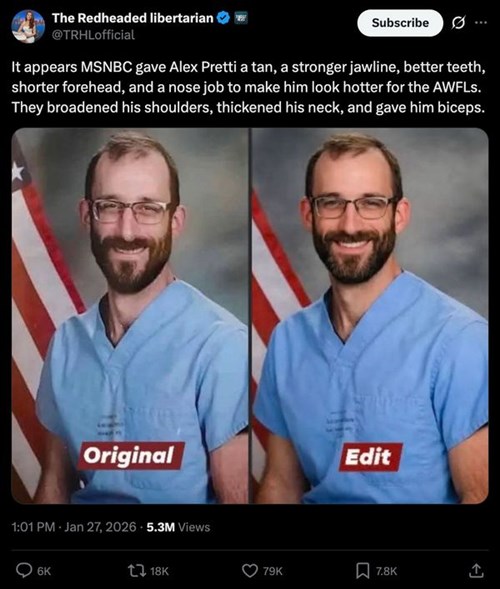 Vicces amúgy, de ha már itt tartunk, akkor ez fordított rasszizmus, illetve antiszemitizmus, nem? Az AI-képet felhasználók ugyanis feltételezték, hogy Pretti eredeti kinézete nem lesz túl szimpatikus a felhasználóknak, ezért inkább európai vonásokat adtak neki, mert az jobban néz ki, és bizalomgerjesztőbb. Ezek szerint az MS NOW liberális munkatársai is tisztában vannak az igazsággal?