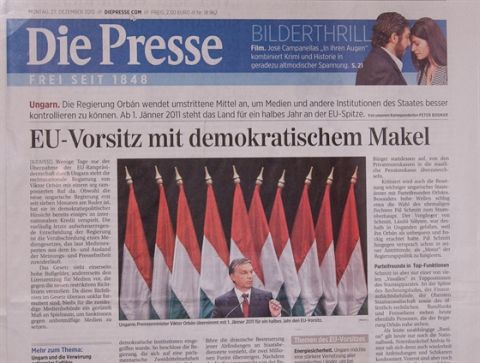 A bécsi konzervatív napilap, a Die Presse, amely az elmúlt napokban többször foglalkozott kritikus hangnemben hazánkkal a nemzetközileg is vitatott médiatörvény kapcsán, hétfőn az egész címlapsztoriját és teljes második oldalát szentelte a témának.