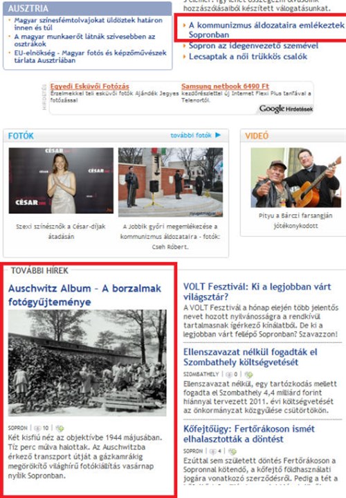 Érdemes megfigyelni a képen, vagy itt ellenőrizni, hogy ugyanakkor A kommunizmus áldozataira emlékeztek Sopronban című anyaguk csak egy képek nélküli rövid hír, a kapcsolódó anyagaiknak meg köze nincs se a kommunizmushoz, se a megemlékezéshez. Így "tájékoztatnak", tudósítanak odaát.